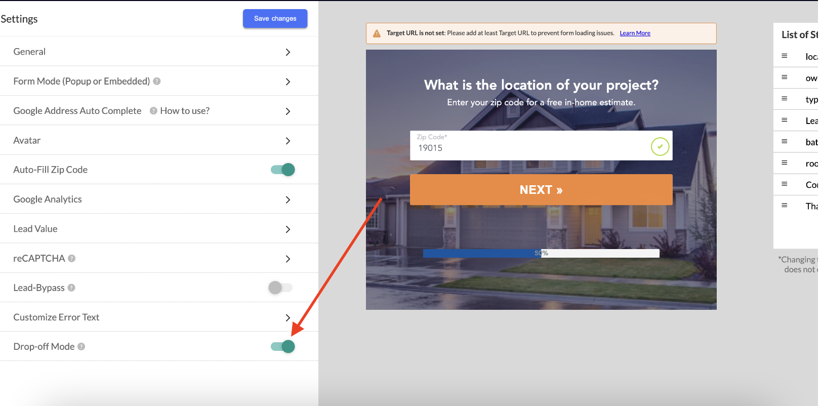 Drop-Off Mode enables LeadCapture.io to push a partial submission to your connected CRM or lead distribution tool (like LeadProsper, Zapier, etc.) if a user abandons the form after entering their contact details.